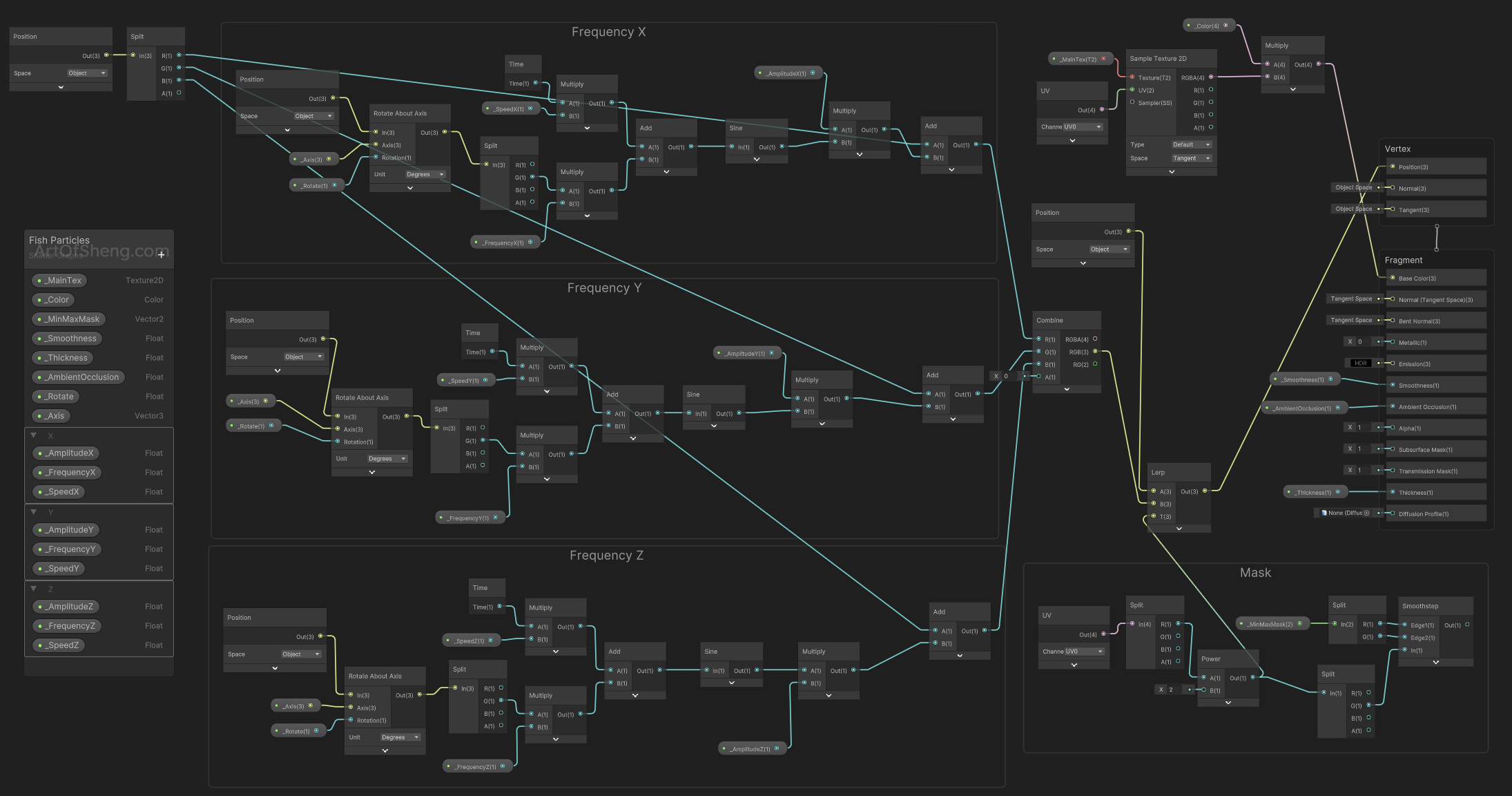 Fish and seaweed geometry are animated with a vertex shader created in Shader Graph. The ocean is then populated with fish using particle systems.