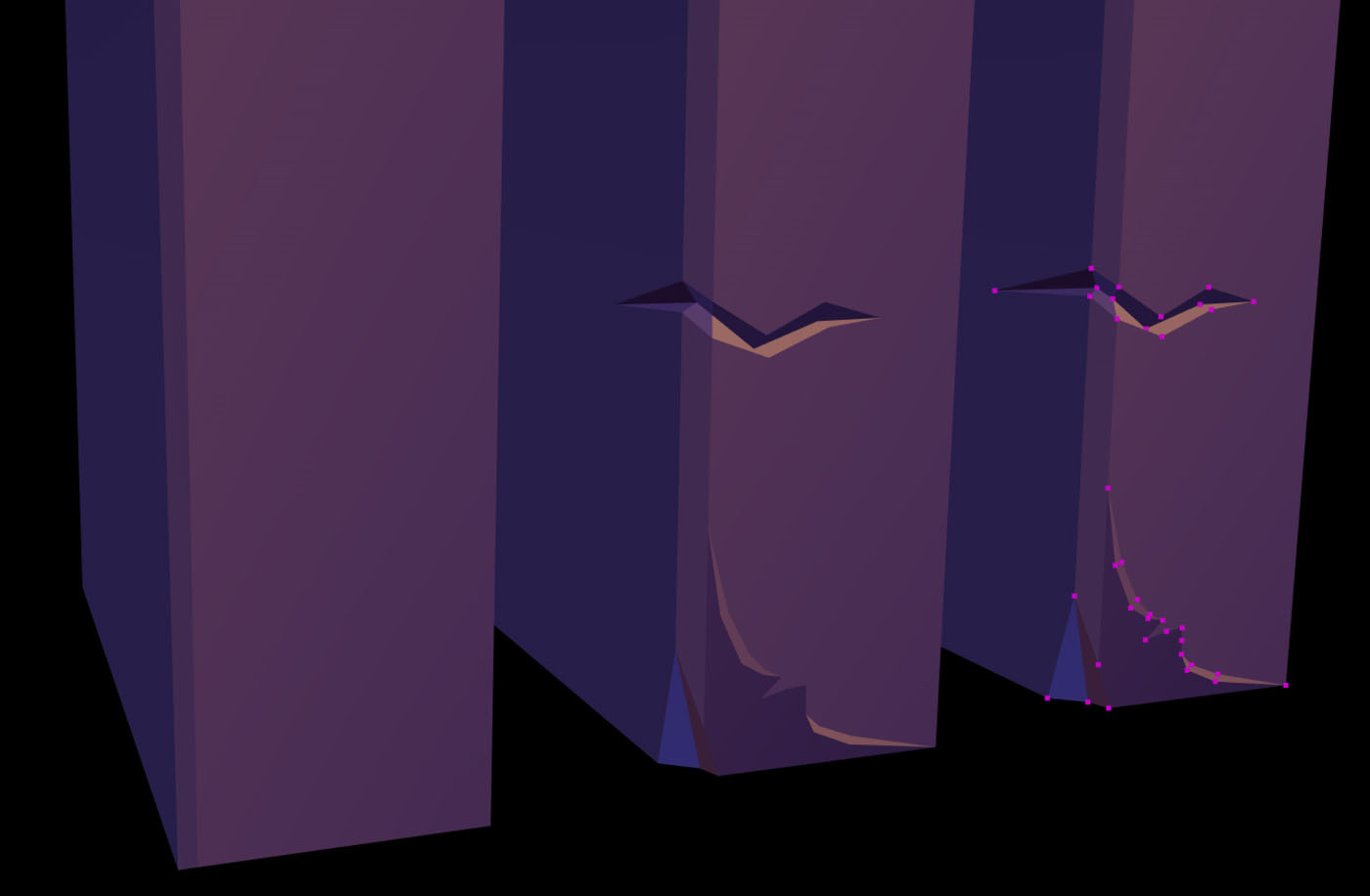 To combat this, I played around with using more geometry to build shapes, silhouettes and details instead of using texture maps. The UVs of these shapes are squished infinitely small and then mapped to single pixels in a texture map, treating them more like a lookup table. For gradients, the UVs would be scaled to 0 in one axis only.